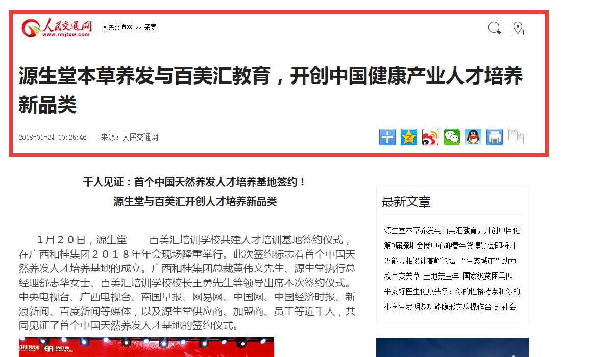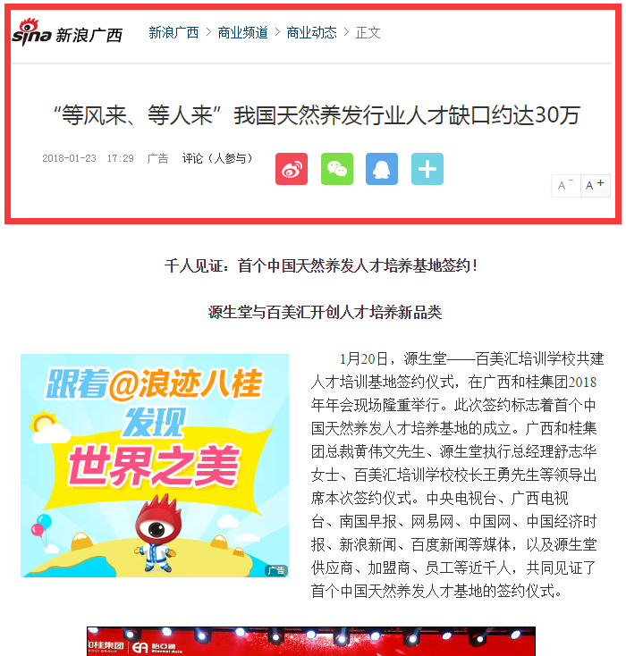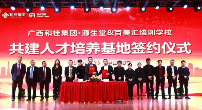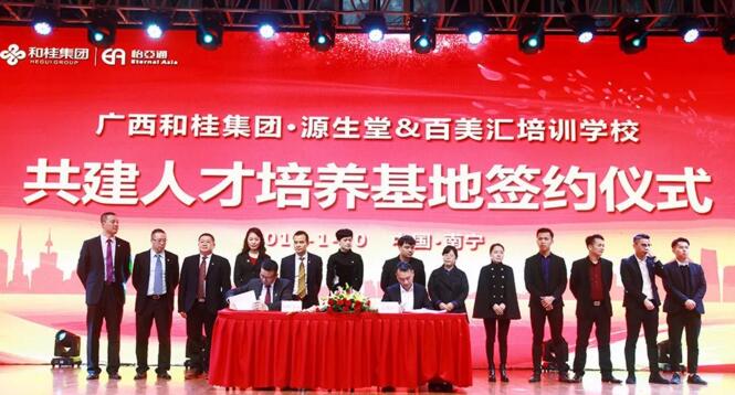 1月20日,源生堂與百美匯培訓(xùn)學(xué)校共建人才培訓(xùn)基地簽約儀式,在廣西和桂集團2018年年會現(xiàn)場隆重舉行。此次簽約標志著首個中國天然養(yǎng)發(fā)人才培養(yǎng)基地的成立。廣西和桂集團總裁黃偉文先生、源生堂執(zhí)行總經(jīng)理舒志華女士、百美匯培訓(xùn)學(xué)校校長王勇先生等領(lǐng)導(dǎo)出席本次簽約儀式。中央電視臺、廣西電視臺、南國早報、網(wǎng)易網(wǎng)、中國網(wǎng)、中國經(jīng)濟時報、新浪新聞、百度新聞等媒體,以及源生堂供應(yīng)商、加盟商、員工等近千人,共同見證了首個中國天然養(yǎng)發(fā)人才基地的簽約儀式。